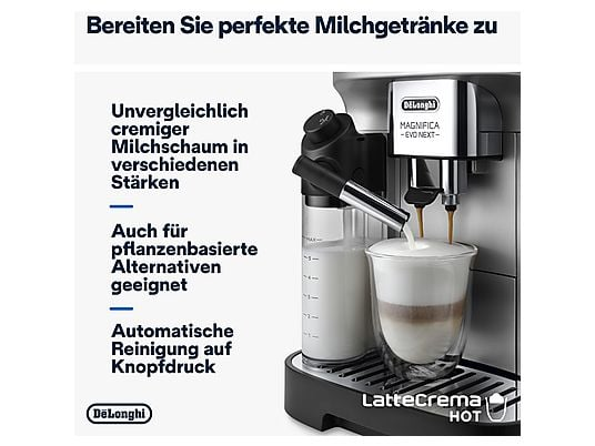 Magnifica Evo Next verkörpert die langjährige Erfahrung und das technische Know-How von De’Longhi mit dem Anspruch auf perfekten Kaffeegenuss. Immer frisch gemahlen und perfekt aufgebrüht. Der De‘Longhi Kaffeevollautomat bedient jeden Kaffeegeschmack mit einem benutzerfreundlichen Bedienfeld, auf dem farbige Icons, ein farbiges TFT-Display und Navigationstasten den Benutzer in eine Welt von Kaffeegetränken führen, die vollständig personalisierbar sind. Sie können die Parameter Ihrer Getränke ganz einfach einstellen, indem Sie zwischen 5 Tassen-Größen, 4 Intensitätsstufen und 3 Temperaturoptionen wählen. Mit der My-Funktion können Sie die Menge noch individueller gestalten. Nachdem Sie Ihre Getränke angepasst haben, können Sie sie in Ihren Profilen speichern, sodass die Maschine Sie und Ihre Vorlieben kennt. Das LatteCrema Hot Milchsystem sorgt für einen dichten Milchschaum mit der perfekten Temperatur für all Ihre Milchgetränke.